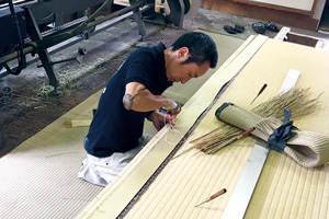畳表の材料のイグサは多年生の植物で、熊本、広島、岡山、福岡、高知などを中心に栽培されています(中国産もあります)。苗の手植えは真冬に行われます。春に新芽の発育を促すためにイグサを45cmほどの長さに切りそろえる先刈りという作業を経て、夏に1.5mほどになったものを刈り取ります。イグサは織機を使って畳表に編み上げられ、畳一帖分に使用されるイグサは約4,000本、高級な畳では約7,000本ものイグサが使われます。経糸は主に麻糸と綿糸で、高級品にはマニラ麻糸が使われます。